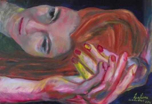 | “RUST” (2011) Handen leiden een eigen leven en kunnen zeer veel uitdrukken. Onmogelijk om ze tijdens een gesprek stil te houden, ze moeten aandacht vragen, vertellen, benadrukken. Ze zijn ook zeer creatief. Als ze met kunst bezig zijn, zijn het zeer nuttige werktuigen, want dan corresponderen ze met de ogen. En af en toe moeten ze kunnen rusten, zoals hier op dit schilderij. |