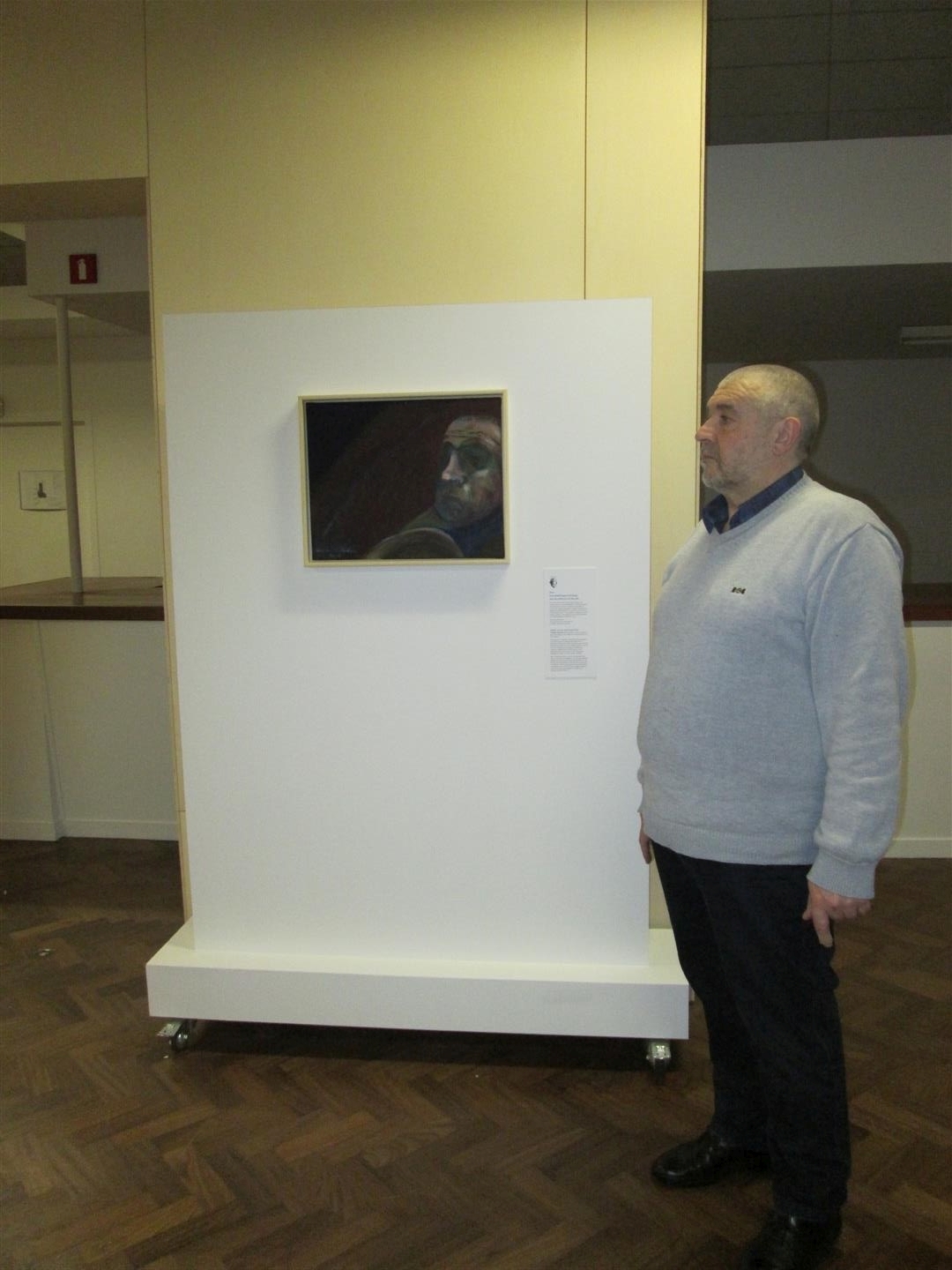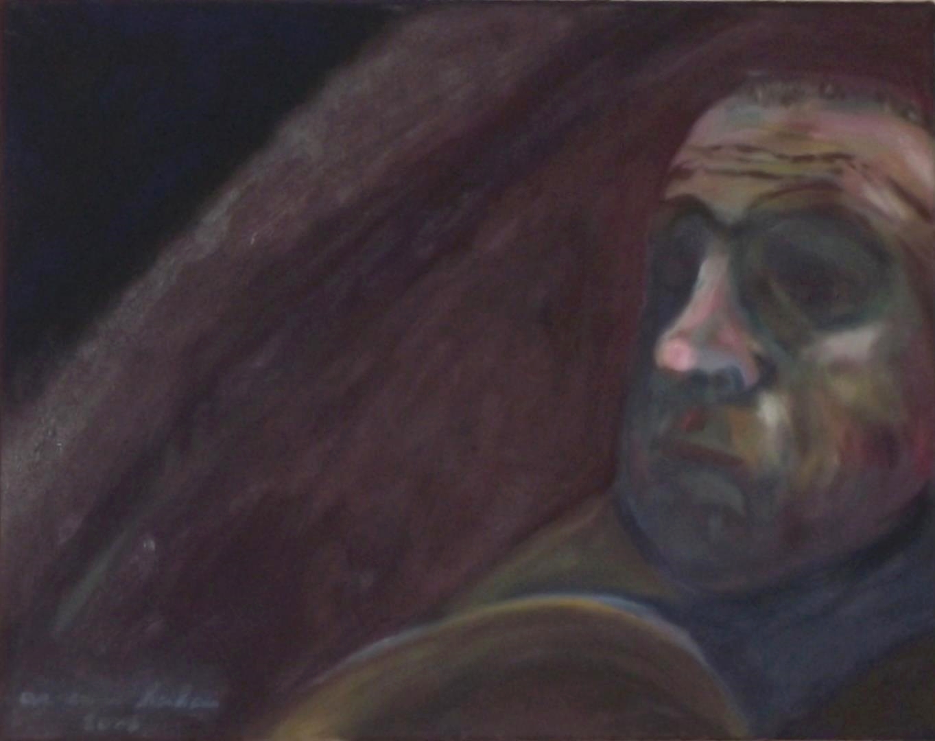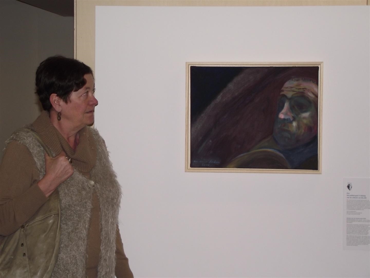 Sinds kort ben ik op pensioen. 37 jaar lang werkte ik in de administratie van de afdeling Neurologie van het Universitair ziekenhuis van de VUB te Jette. Vanuit die context ontstond mijn interesse voor wat zich in het hoofd van een mens afspeelt en hoe zich dit uit in de expressie van het gezicht. Vandaar mijn interesse voor (zelf)portretten. Ik schilder graag. In alle bescheidenheid. Ik vind het telkens weer een prettige oefening en ik hoop er nu meer tijd voor te hebben. Mijn schilderij heet ‘Man in cinema’. Het ontstaan ervan berust op een hoop toevalligheden. Toen ik enkele maanden geleden met mijn man in de cinema zat, ontdekte ik in mijn handtas een fototoestelletje. Ik nam een foto van mijn man in het donker. De foto had een duidelijke link naar het werk van Spilliaert vond ik: donkere kleuren, akelige schaduwen, vooral in de ogen, zwarte oogkassen. Het gaf me de inspiratie voor dit schilderij. |